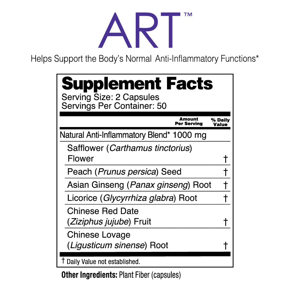 The botanicals found in ART help support the body’s normal anti- inflammatory response, healthy joints and overall wellness. Scientists have found strong research on: peach seed, safflower, Asian ginseng, licorice root, Chinese red dates, and Chinese lovage to support these functions. These wholesome ingredients are exceptionally good at supporting your body’s normal anti-inflammatory functions.*
