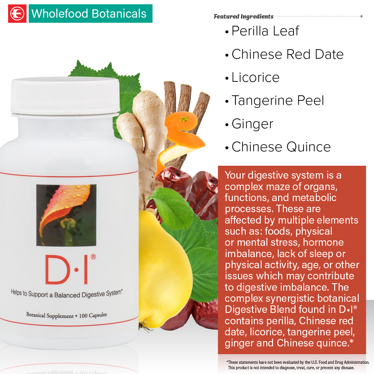 Your digestive system is a complex maze of organs, functions, and metabolic processes. These are affected by multiple elements such as: foods, physical or mental stress, hormone imbalance, lack of sleep or physical activity, age, or other issues which may contribute to digestive imbalance. The complex synergistic botanical Digestive Blend found in D•I contains perilla, Chinese red date, licorice, tangerine peel, ginger and Chinese quince. The digestive system receives and processes these wholesome food ingredients and uses them to support the function and balance of the full digestive tract. These ingredients have been traditionally used for generations for supporting digestive health. Daily, consistent use of D•I helps to promote digestive health.*