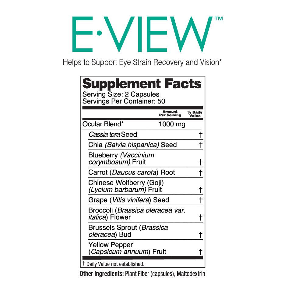E-View contains an Ocular Blend of many wholesome food ingredients that science has shown to be beneficial for eye strain recovery and vision as well as overall wellness.*