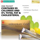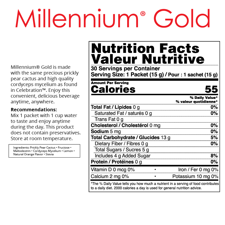 Cacti have a treasure trove of nutrients beneath their rugged exterior, helping them survive harsh and barren deserts. Millennium Gold is made with the same precious prickly pear cactus and high-quality cordyceps mycelium found in Celebration, along with lemon. Natural orange and lemon provide a satisfying flavor for this delicious beverage mix. Made from hand-picked cactus and filtered to remove irritating components, Millennium Gold is carefully packaged into convenient single serve packets.