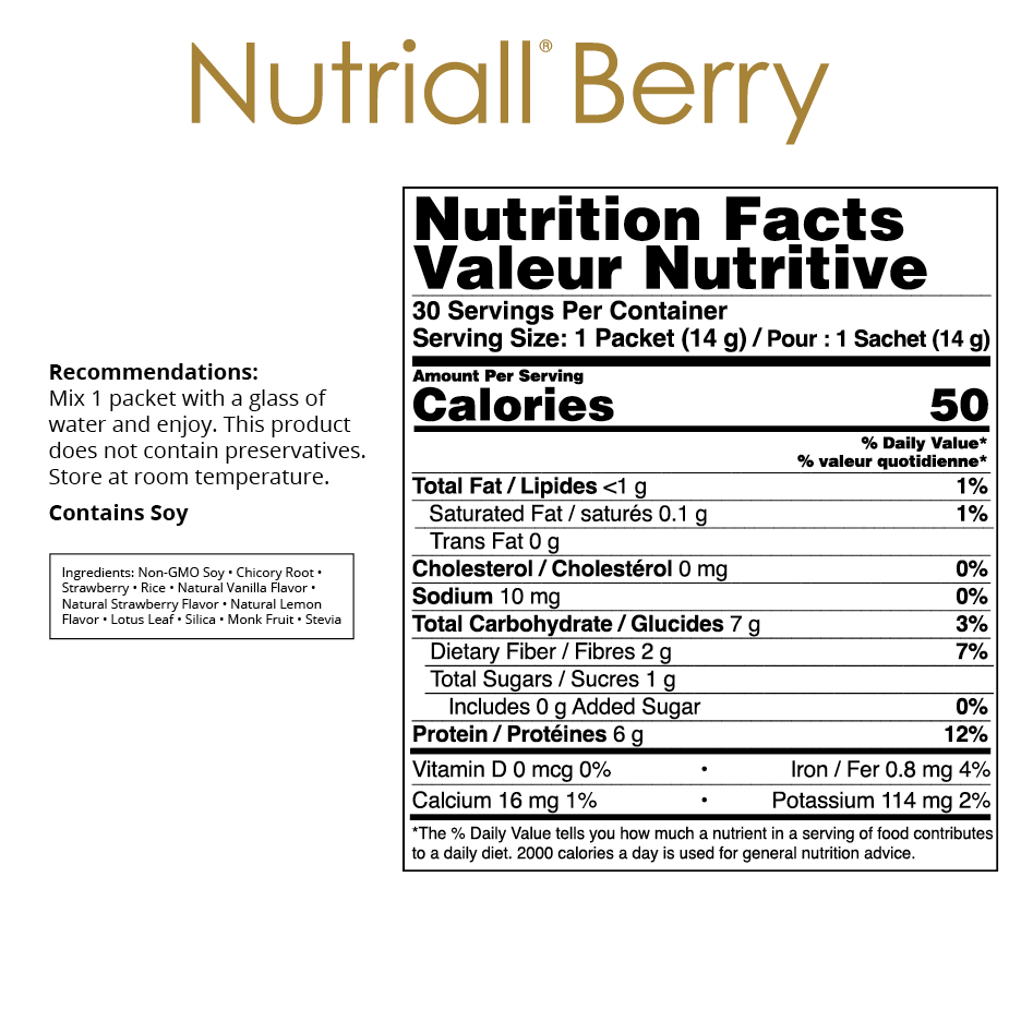 Two packets of Nutriall Berry contain 12 g of whole non-GMO soy, which is a healthy nutritious source of plant protein. It also features wholesome botanical ingredients such as sacred lotus leaf and chicory root, which align with a healthy lifestyle.*