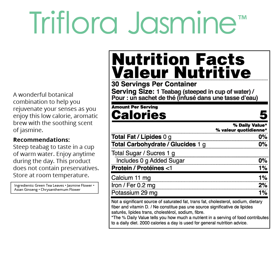 Triflora Jasmine is a low-sugar, green tea infused with the soothing scent of jasmine. Featuring whole food ingredients, such as Asian ginseng and chrysanthemum, relax and refresh your senses as you enjoy the aromatic brew of Triflora Jasmine.