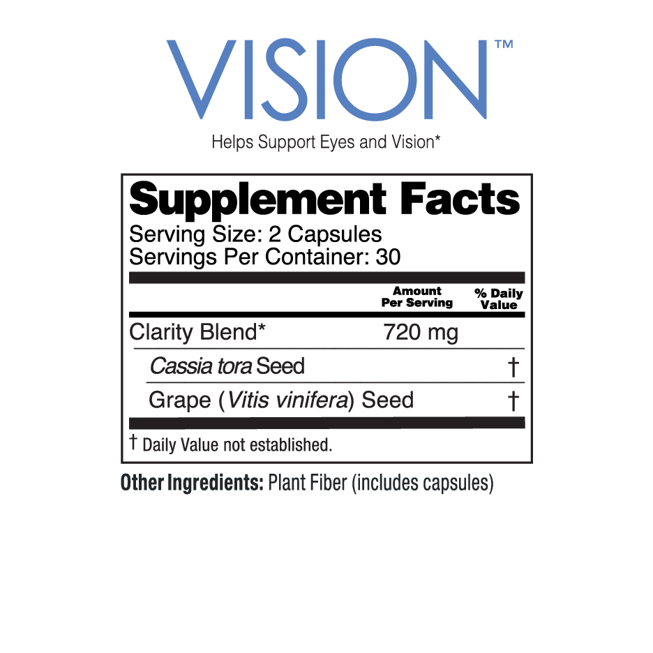 Eyesight is one of our most important senses. 80% of what we perceive comes from the sense of sight. In fact, a larger part of the brain is dedicated to vison than to hearing, taste, touch and smell combined. The eyes can capture and interpret more than one-million pulse signals per millisecond and transmit them to the brain. Yet, many of us take our eyesight for granted. This unique botanical Clarity Blend combines grape seed and Cassia tora which may provide the needed support for eyes and vision. OPCs found in grape seeds and flavonoids in Cassia tora, offers an extra measure of support for healthy eyes. Vision™, when taken on a daily basis, delivers these two essential ingredients which may help to support the integrity of the retina and cornea of the eye.*