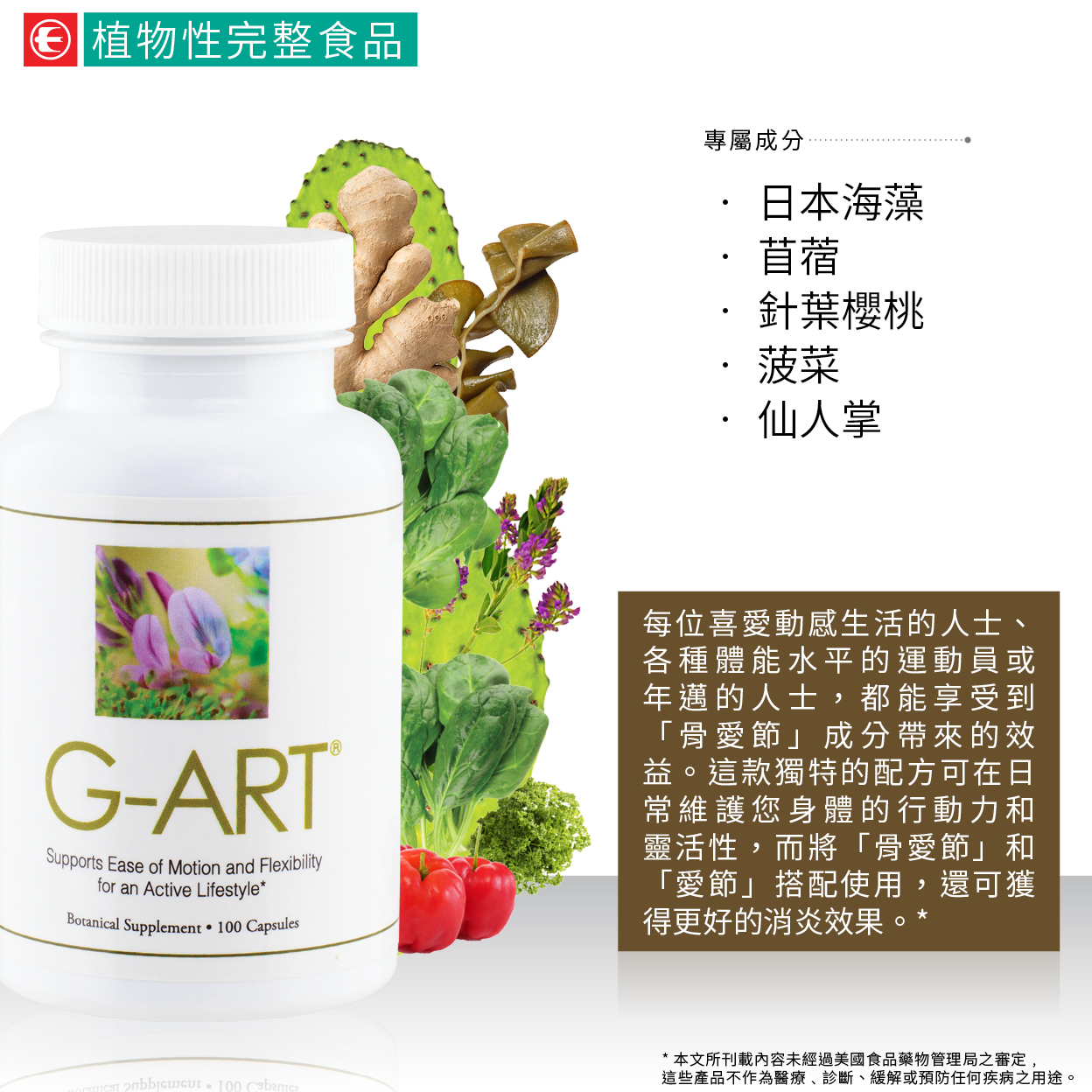 「骨愛節」中所含的關鍵性完整食物成分:日本海藻、生薑、苜蓿、針葉櫻桃、菠菜和仙人掌,可使人體的行動更自如,關節的轉動更舒適、更靈活,同時也有益於關節和骨骼的健康。「骨愛節」不含任何合成的或人造的成分,是以天然的食物為人體消炎。不論您的體能水平如何,這款促進行動力的產品都可為您充滿活力的日常生活提供幫助。同時,本產品也十分適合年邁的人士選用。*
