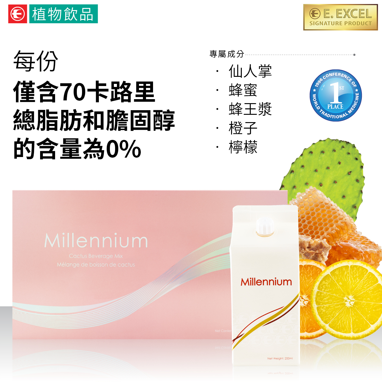 仙人掌的外表雖然凹凸不平,但表皮下卻蘊含著營養的寶藏,而也正是這豐富的營養才使其能在嚴酷而貧瘠的沙漠中得以生存。「千禧泉」就含有與「歡慶」中相同的仙人掌,同時還含有蜂王漿和蜂蜜。1996年,丞燕創新性的「千禧泉」配方,在「世界傳統醫學大會」上贏得了頭等獎。該產品以去除了刺激性成分的手工挑選的仙人掌製成,並被精心地包裝在便捷而優質的專利包裝盒中,所以它既不含防腐劑又能保持新鮮。