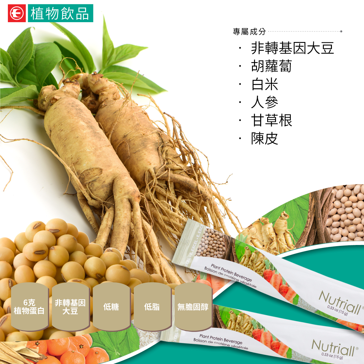 非轉基因大豆、白米、胡蘿蔔、天然香草味、二氧化矽、人參、甘草根、陳皮、甜葉菊